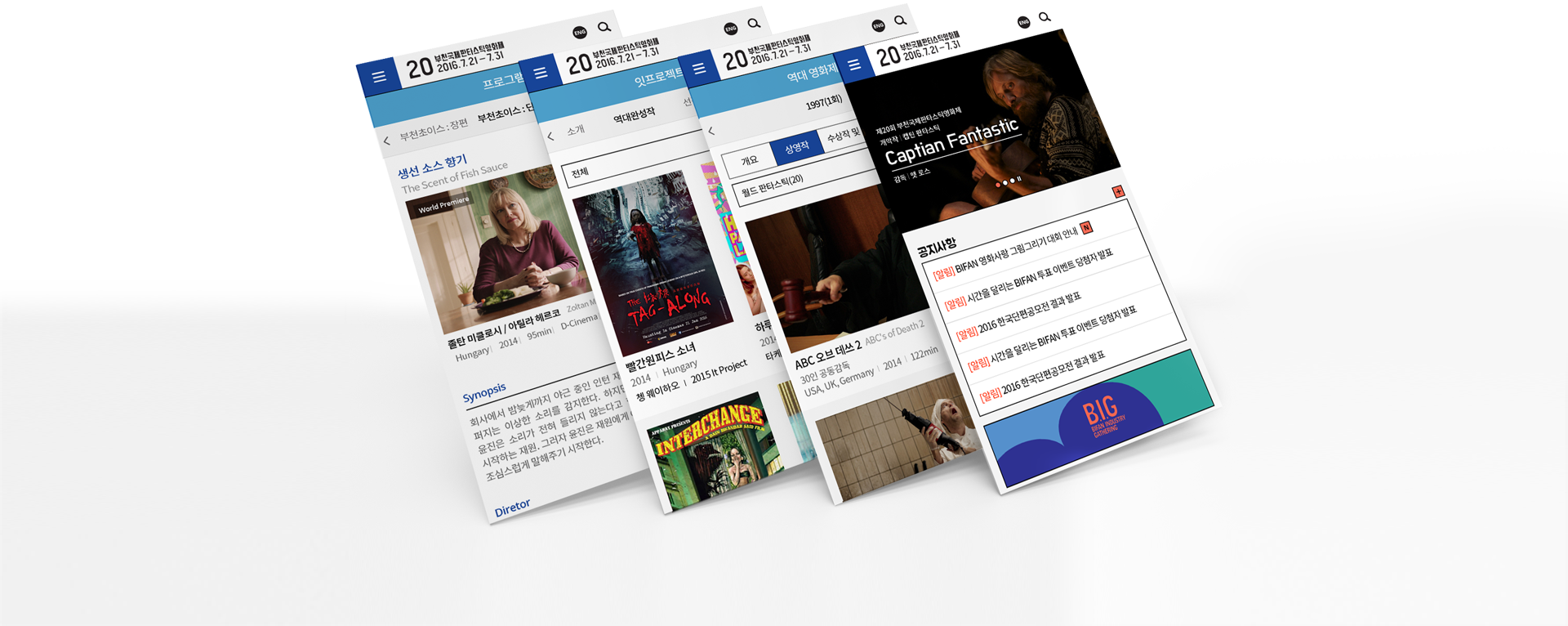 올해로 20주년을 맞이한 부천국제판타스틱영화제의 포스터를 모티브 삼고 다채로운 컬러의 조화를 통해 영화인들 시선을 사로잡을 수 있도록 기획 및 디자인을 개편하였다. 또한 최신 웹트렌드를 반영하고 웹 표준 및 웹 접근성 준수를 통한 사용자 중심의 웹 서비스를 제공하도록 구현하였다.